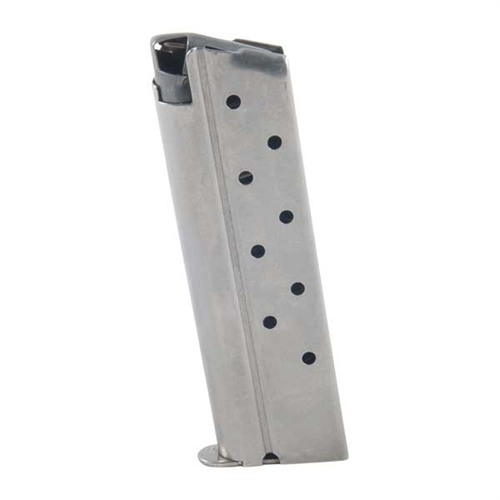 Natural-finish stainless steel (Stnls). Approximately 5" (12.7cm) long. Followers – Stainless steel, natural silver finish, round contour. Some magazines feature a concave safety orange nylon follower.