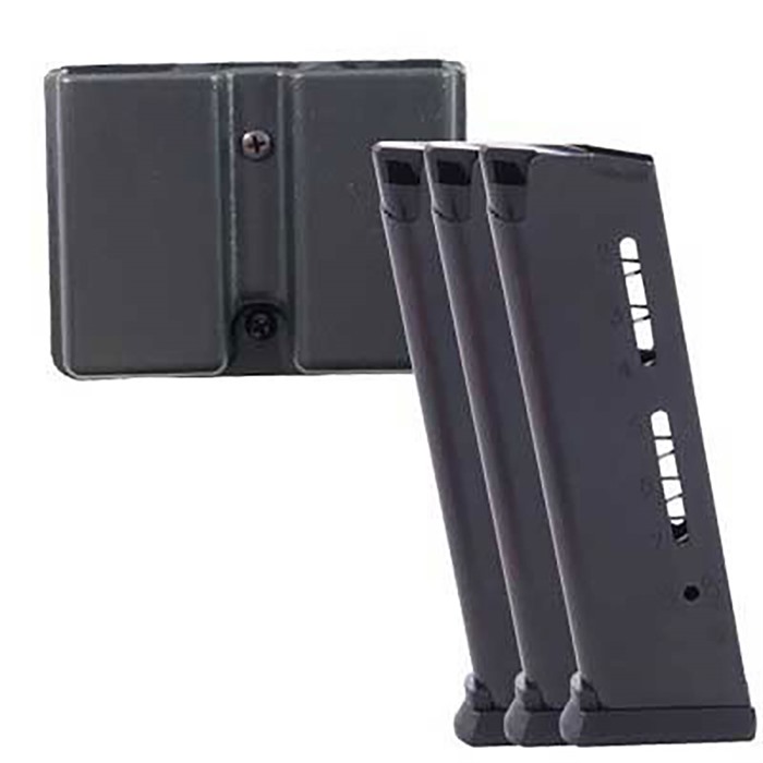 The .45 ACP fits Gov’t Model; with an 8 round capacity, round-count numbers are stamped on the body next to witness holes. Available in natural Silver or Black Oxide finish in singles or in convenient, money-saving 3-Paks, with or without a Michael’s of Oregon double mag pouch made of rugged, high-impact Kydex® molded polymer.