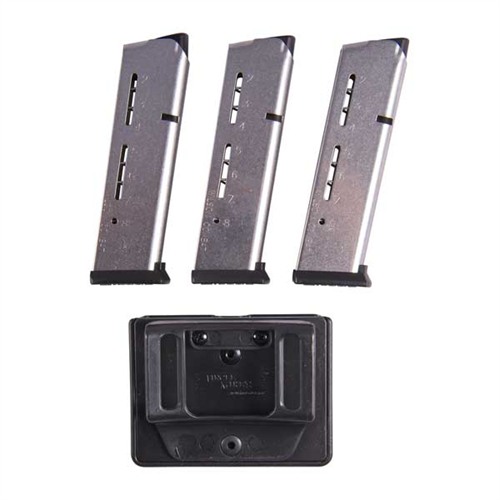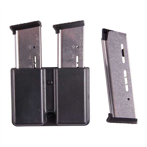 Compatible with Gov’t Model; holds 8 rounds; round-count numbers are stamped on the body next to the witness holes. Available in natural Silver or Black Oxide finish, these magazines can be purchased individually or in convenient, money-saving 3-Paks, with or without a Michael’s of Oregon double mag pouch made from rugged, high-impact Kydex® molded polymer.