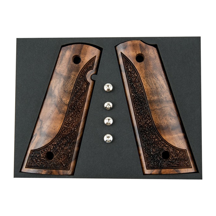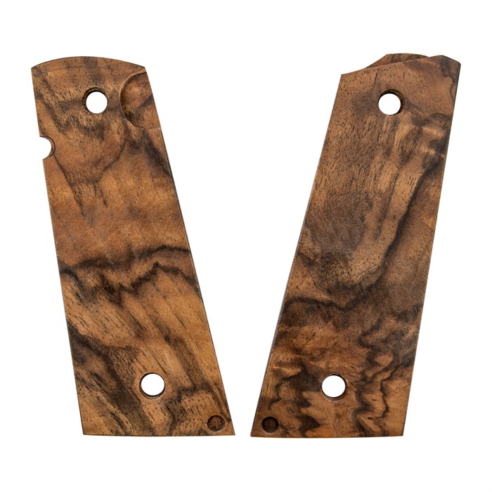 Introducing the 1911 Exotic Wood Grips by Artisan Stock and Gunworks Inc, meticulously crafted from premium Turkish walnut. These grips are designed to enhance both the aesthetics and functionality of your Government and Commander Single Stack 1911 handguns.