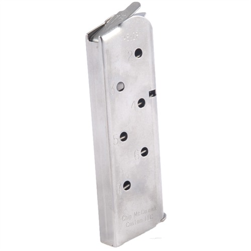 Constructed from stainless steel with a matte finish, the magazine measures .45 Off. ACP - 4½" (11.4cm) long, 5" with pad, and holds 7 rounds.