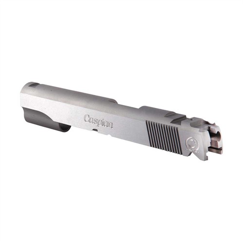 - Caspian custom-quality slides are made of heat-treated 4340 carbon steel for strength and stability, with a matte finish and deep-cut serrations.