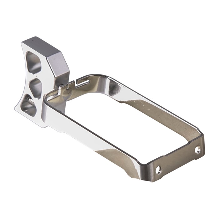 - The trigger system comes in various sizes and with both curved and flat trigger faces, and this particular model is medium-sized and silver.