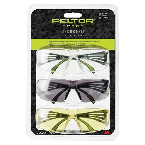 Introducing the Securefit 400 Safety 3 Pack from 3M COMPANY, designed for those who prioritize safety without compromising on style. This versatile pack includes three different lens options: clear, amber, and gray, catering to various lighting conditions and environments.