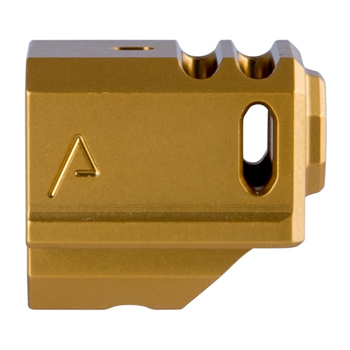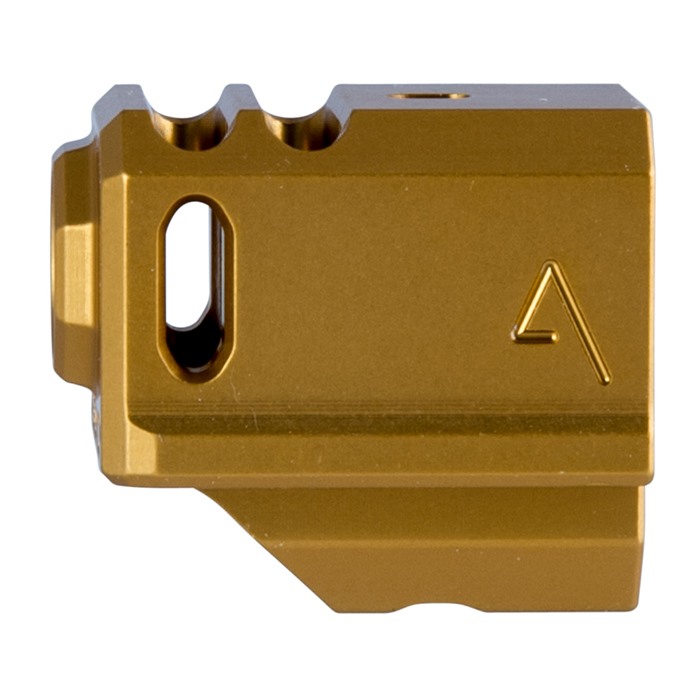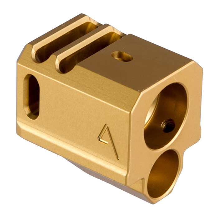 - Constructed from 7075 aluminum with a two-chamber design, it features vertical and side ports, and is available in black and gold finishes.