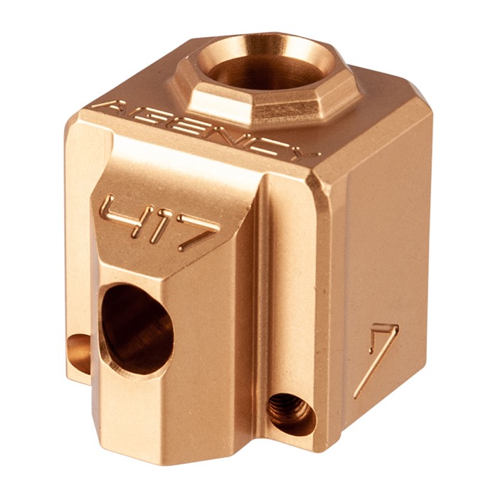 - The Agency Arms 417S Compensator is designed for Glock models 17, 19, 34, 26, 45, and 19X, featuring a gold finish and compatibility with 9mm rounds.