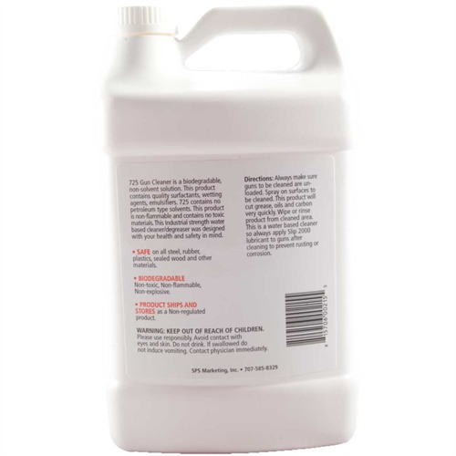 815706002155 725 Gun Cleaner should truly be called Super Degreaser judging from the way it out-performs competitive products. This cleaner will cut through the toughest cosmoline, carbon, grease and grime! Its super strength allows it to degum and degunk the dirtiest of gun parts when sprayed on or used in parts washers or solvent tanks! Inhibited to help protect sensitive metals, 725 Gun Cleaner has been thoroughly tested in the field by shooters and gun smiths and has come through with flying colors! Hands-on Gunsmiths and Armors praise how quickly it dissolves in warm water, how well it works in both hard and soft water, how freely it rinses to leave parts bare-metal bright, how long it lasts for savings in product upkeep and disposal cost reduction. Water based avoids environmental and health safety issues Non-Caustic helps eliminate caustic burns and fumes Non-petroleum helps eliminates fire hazard and disposal problemsDelivery time approx. 7-14 days.
