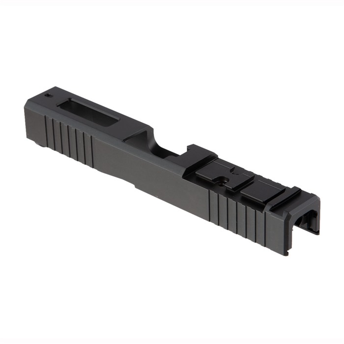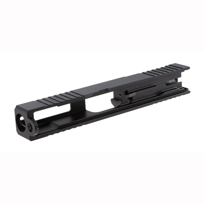 - Includes a distinctive top window cutout for aesthetic barrel display and heat dissipation, as well as front and rear serrations for improved slide manipulation.