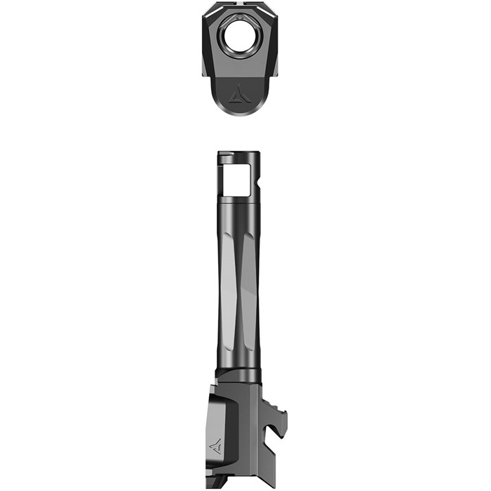 810098420686 AFTERBURNER + RAMJET FOR GLOCK 43 The Radian® AFTERBURNER™ + RAMJET™ combo provide unprecedented recoil reduction and match grade accuracy in a concealed carry package. The threadless barrel design allows for effortless install/removal for cleaning, while LEGAL FOR SALE IN ALL 50 STATES*. The AFTERBURNER™ compensator is machined from hardened stainless steel and the RAMJET™ barrel from hardened 416R SS; both are enhanced with a Radianite™ coating. This combination achieves low friction, high hardness, and high corrosion resistance, making overall durability and erosion from muzzle blast a non-issue. Angled front faces on the AFTERBURNER aid in holstering. The INTRA-LOK® mounting system uses the taper lock principle; a tapered locking screw interfaces with an angled V-groove on the underside of the barrel. This perfectly times the compensator as it locks down onto the upper barrel profile on the muzzle end of the barrel. INTRA-LOK® allows the user to simply slide the compensator over the barrel, insert and tighten the locking screw, making for a simple and repeatable installation process. This system allows the user to easily remove the barrel from the slide for cleaning. DISCLAIMER: “GLOCK” is a federally registered trademark of GLOCK, Inc. and is one of many trademarks owned by GLOCK, Inc. or GLOCK Ges.m.b.H. Neither Brownells nor this site are affiliated in any manner with, or otherwise endorsed by, GLOCK, Inc. or GLOCK Ges.m.b.H. The use of “GLOCK” on this page is merely to advertise the sale of GLOCK pistols, parts, or components. For genuine GLOCK, Inc. and GLOCK Ges.m.b.H. products and parts visit www.glock.com.