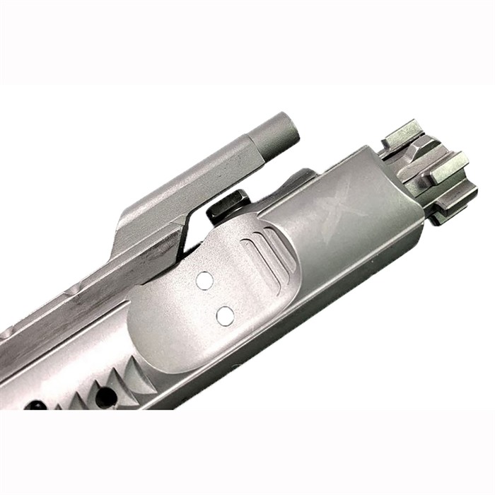 • Serrated Surface: The concave area forward of the gas vents is machined with a serrated surface to facilitate silent bolt closing on upper receivers without a forward assist.