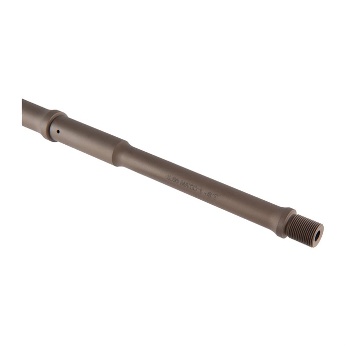 - The 16" 5.56 NATO barrel is finished in Flat Dark Earth, features a 1:8 twist rate, mid-length gas system, and 1/2-28 muzzle threads.