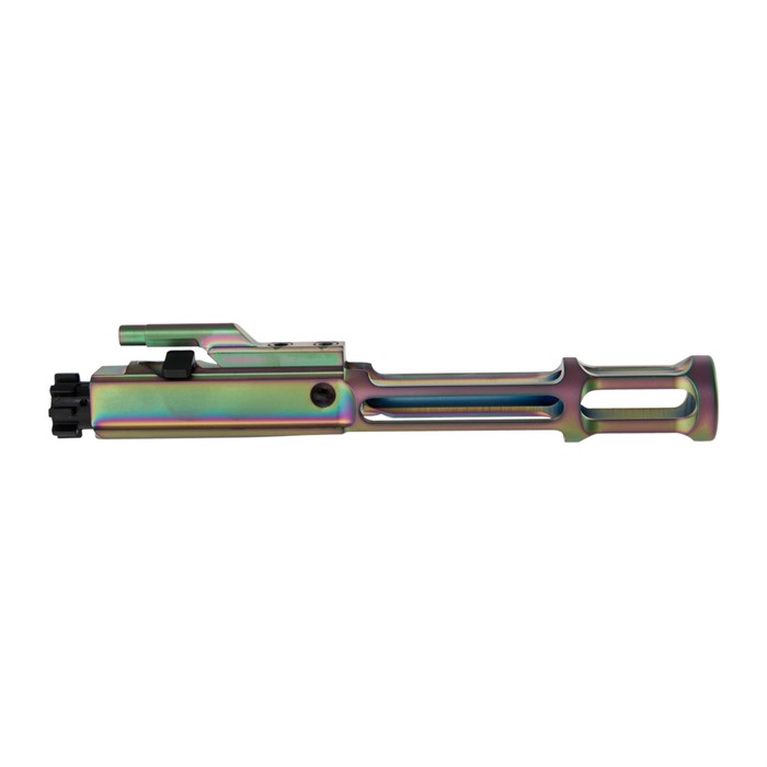 The bolt is made from 9310 tool steel, which is stronger than C158, and the assembly is nitrided to increase surface hardness, reduce resistance, and enhance corrosion resistance compared to standard chrome and phosphated bolt carrier groups. All bolts undergo full Magnetic Particle Inspection (MPI) to ensure material integrity and defect-free performance.