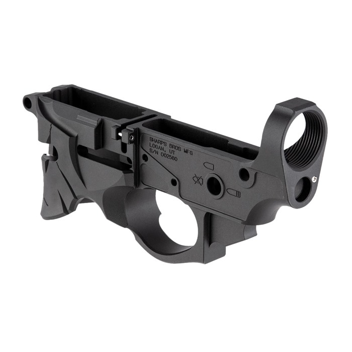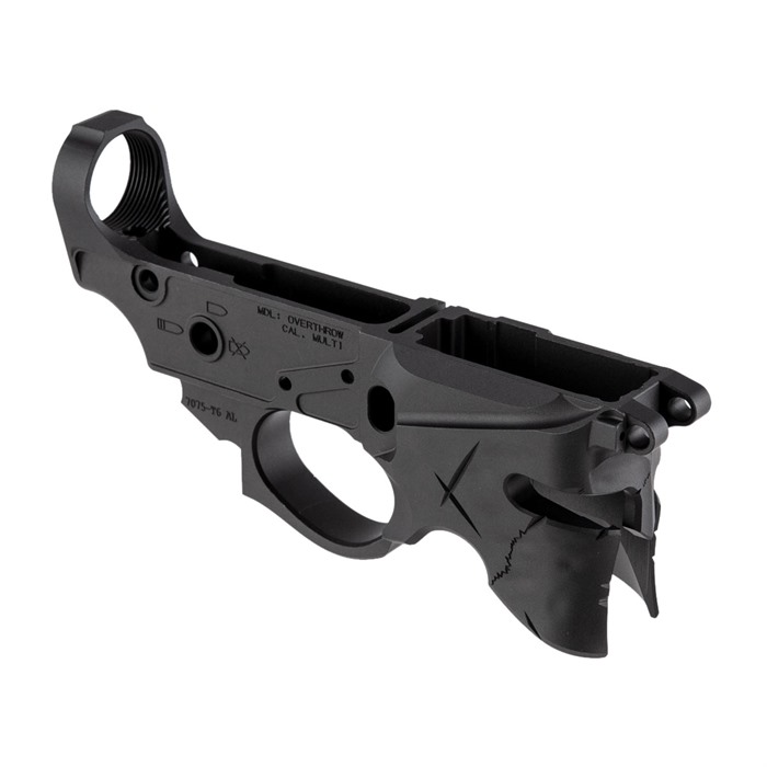 - The Sharps Bros. Overthrow AR-15 Lower Receiver features a unique design with a battle-worn appearance, including dents, sword gashes, and crack lines.