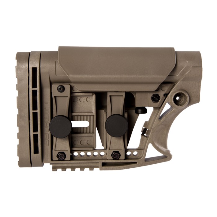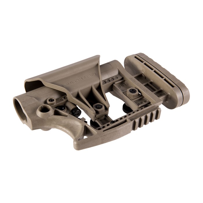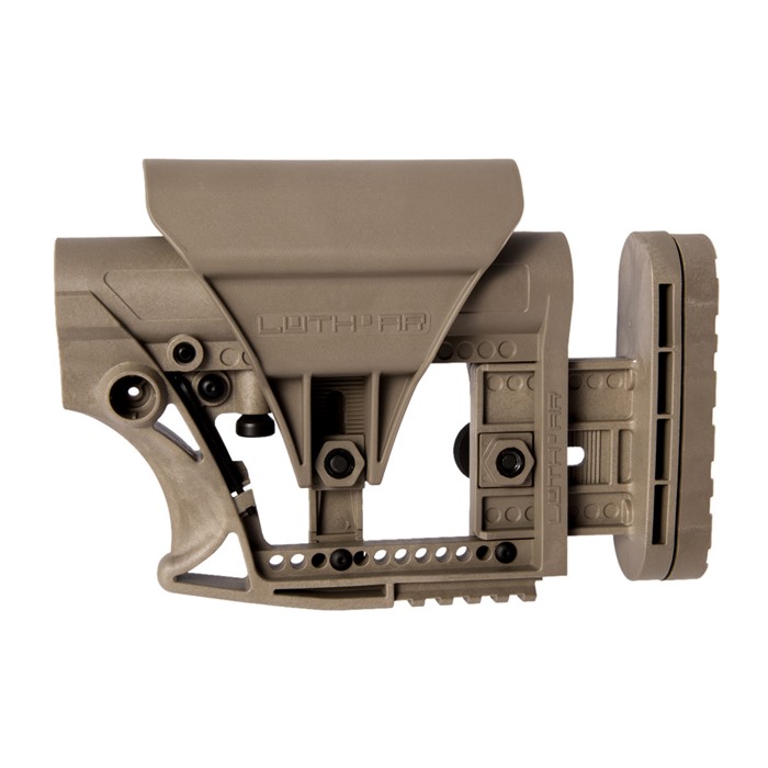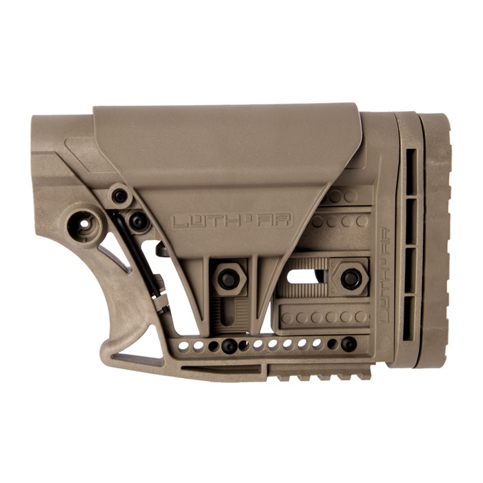 The Luth-AR adjustable buttstock is constructed of durable lightweight polymer and is available in black or FDE, making it a versatile choice for any shooter.