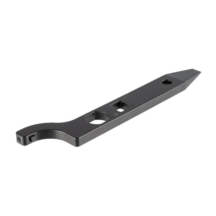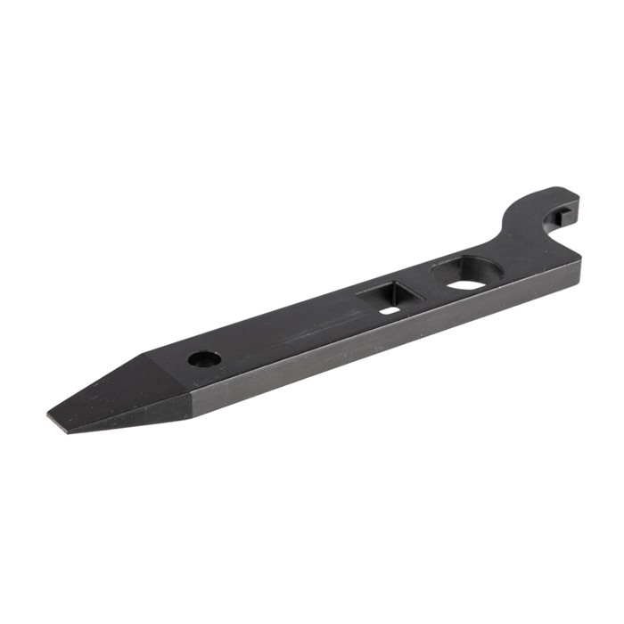050806107236 Our handy, compact tool is uniquely designed to combine several tools into one. It has a spanner wrench that fits the receiver extension castle nut on M4-style collapsible buttstocks, with interchangeable pins to fit nuts with both old (round) and new (square) teeth, so you're ready for whatever type of nut is on the gun in front of you. Pins for both styles are included and easily changed by loosening a hex screw in the tool. For fixed rifle buttstocks, there's a screwdriver blade to remove the buttplate screws and a wrench for the nut on the receiver extension (buffer) tube. There's even a ½" square opening for a torque wrench, and even a hole for hanging the tool on your peg-board. Fits easily in a range bag or in your pocket for use outside the shop.Delivery time approx. 7-14 days.