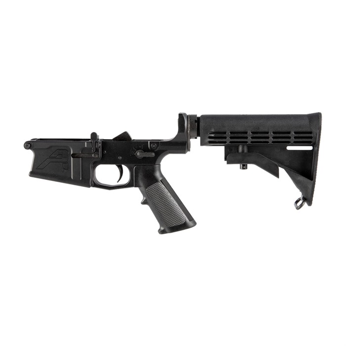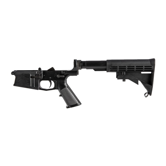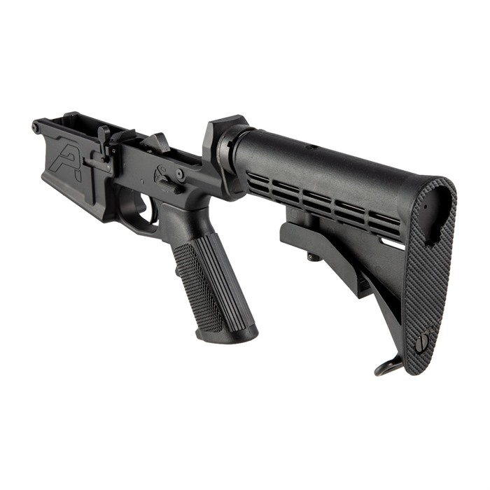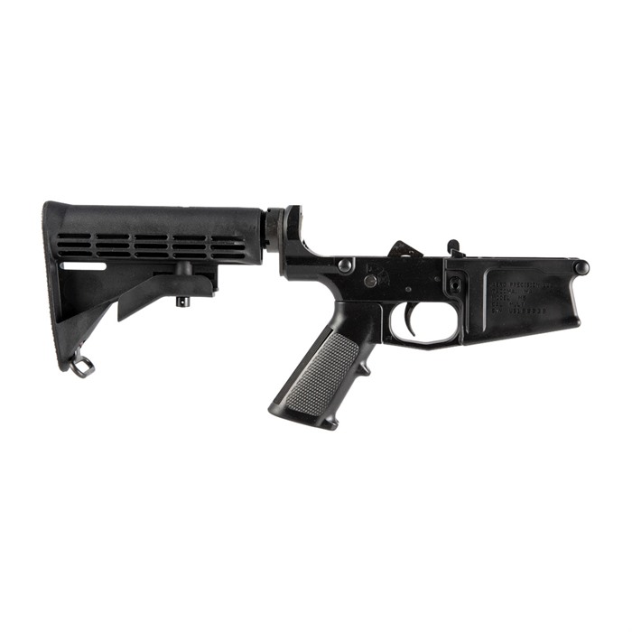 - The lower receiver includes a black anodized finish, M4 stock, A2 grip, and a mil-spec lower parts kit, along with a .308 carbine buffer and spring.