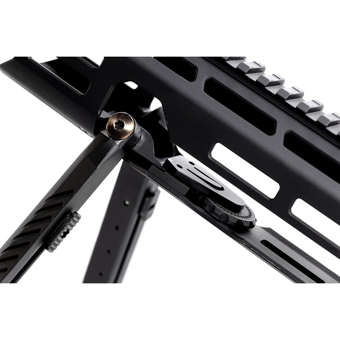 When not in use, the legs of the BLK LBL Bipod easily fold to the rear, flush with the hand guard. This design ensures that the bipod won't catch on clothing, gear, or branches while you're on the move, and it won't interfere when shooting offhand, from a barricade, or during storage.