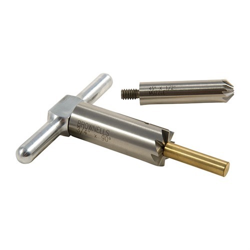 050806022676 Set includes: one, 90° facing cutter to square a muzzle after shortening, or repair damage; one, 45° chamfering cutter to break the edges of the rifling for a clean bullet exit or chamfer a revolver cylinder mouth for quick reloads; plus one handle that fits either cutter and one brass bore pilot. Interchangeable pilot keeps cutter properly aligned. Purchase extra pilots to use one cutter for many different calibers. Pilots for other calibers available separately.Backorderable, delivery time approx. 4-12 weeks from the USA warehouse.