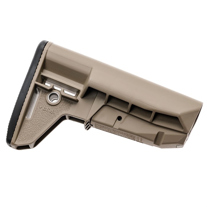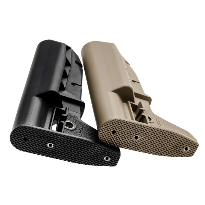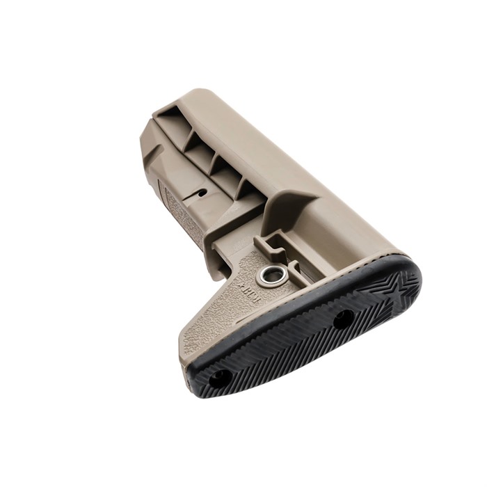 This stock features a patented semi-clubfoot design (United States Patent Number: D901616) that fits on Mil-Spec carbine receiver extensions and is optimized for intermediate length receiver extensions (MK2, AR10, A5). The improved contours enhance shooting in the prone position while remaining snag-free, ensuring no edges catch or tangle in slings, antennas, or other PPE.