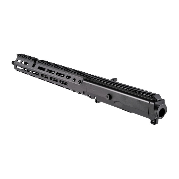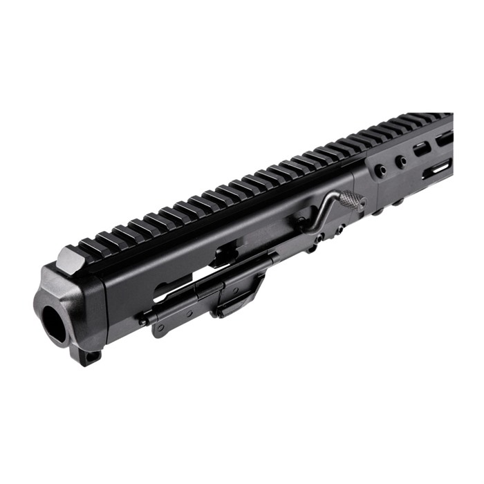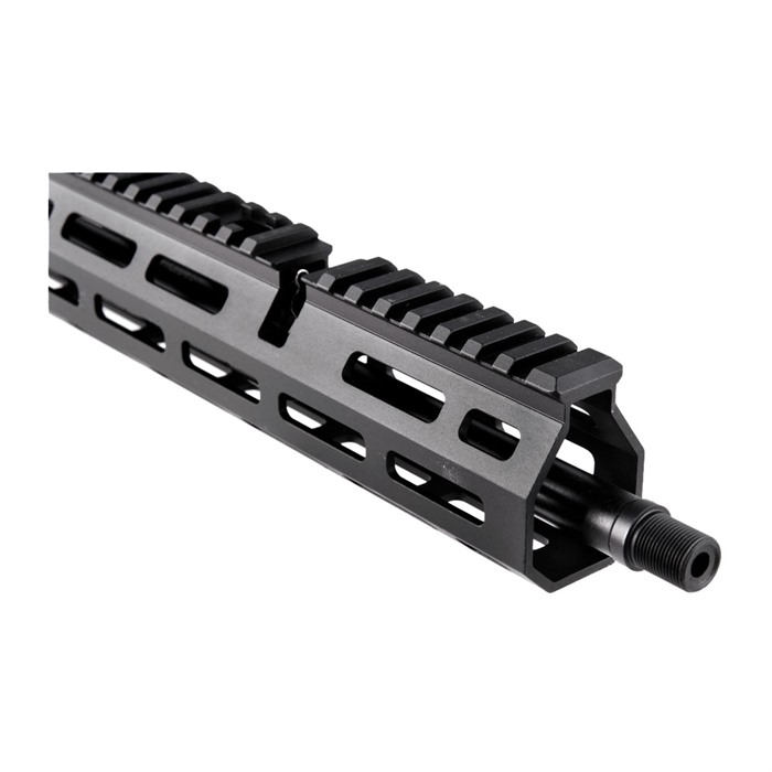 - The upper receiver and handguard are machined from 7075 T6 aluminum with a hardcoat anodized finish, and the product includes a 14.5" nitride finished barrel with a 1-8 twist, but does not come with a muzzle device.