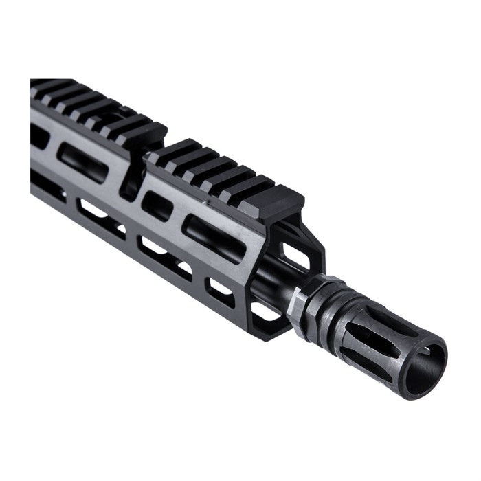 - The upper features a 10" nitride barrel with a 1-8 twist, finished with a classic A2 flash hider and a 5/8-24 muzzle thread for precise suppressor alignment.