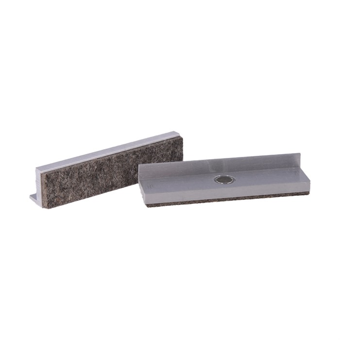 050806001008 Specialized Jaws Help You Get the Most from Your Brownells Bench Vise Jaw inserts slip over the factory jaws of your Brownells Gunsmith's Bench Vise and let you customize your vise for specific projects and types of workpieces. They are faced with different types of material that aid in gripping parts securely, while minimizing risk of damaging or scratching them. The insert bodies made of lightweight yet strong aluminum and are held in place on the vise by powerful rare-earth magnets. The aluminum material prevents the magnets from magnetizing steel parts held in the jaws. Prism Soft Jaws - Polyurethane prism jaw inserts are designed for securely clamping delicate round and oval workpieces without risk of damaging them. "Prism"-shaped cutouts of various sizes in the polyurethane help position the workpieces securely. The soft polyurethane face that is extremely flexible yet resistant to deforming or taking a permanent "set." Once pressure is removed, they will return to their original shape. This material also will not harden with age. Checkered Soft Jaws - These polyurethane jaw inserts have a unique "checkering" pattern on the gripping surfaces to hold delicate small parts without damaging them. The soft polyurethane face is extremely flexible yet resistant to deforming or taking a permanent "set." This material also will not harden with age. Prism Aluminum Jaws - These inserts have a hardness factor between that of copper and lead and are designed for securely clamping round/oval items in the Brownells Bench Vise. One horizontal prism-shaped cutout and three different vertical prisms are designed for securely clamping round or oval workpieces. The 90° cutout in the upper part of these jaws is designed for horizontal clamping of flat material. Grooved Aluminum Jaws - Help you securely clamp cylindrical work pieces in your Brownells vise. Six horizontal grooves hold workpieces securely in place, while a deeper center groove anchors bolts, rods, pins, and other cylindrical parts securely while you work on them. With a hardness factor between that of copper and lead, these jaws are naturally much softer than any steel item they will grasp, so you won't mar the work piece. Fiber Jaws - The dense fibrous material on the faces of these jaws securely holds finely machined or polished parts. The fibers will not mar the polished surface. The dense layers of fiber are heat-resistant and will not deform when clamping warm workpieces. Rubber Jaws - Designed specifically for holding very delicate wood and plastic parts, as well as thin-walled tubes, these jaw have a soft, synthetic rubber facing for gently holding fragile workpieces that can withstand only very light clamping force. The rubber material is backed by three layers of canvas, which counteracts the springy tendencies of the rubber and provides enough stiffness to hold the part securely. Felt Jaws - These jaw inserts have a felt face that is designed for clamping extremely delicate workpieces. The special abrasion-resistive felt material conforms closely the contours of the workpiece, so minimal clamping force is needed to hold the piece in place. Even the most delicate workpieces can be anchored without damaging them. Replacement Factory Steel Jaws - These are the same steel jaws that came installed on your Brownells Gunsmith's Bench Vise when it was new. Over time, the original jaws may become worn or damaged. They are easily replaced by simply removing the two bolts securing each jaw and replacing them with these. The bolts are inserted from the exterior of the jaw body, making them easier to install and less likely to be damaged. Like the originals, these jaws have both a smooth face and a "checkered" textured face. Use the side that works best for the project at hand.Delivery time approx. 7-14 days.