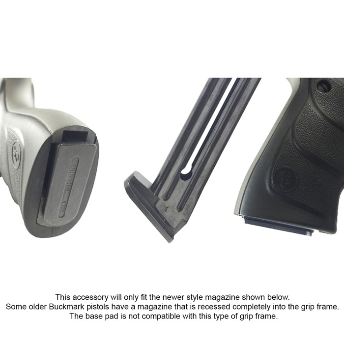 Note: This accessory is compatible only with the newer style magazines for the Browning Buck Mark. Some older Buckmark pistols feature a magazine that is recessed completely into the grip frame, and the base pad is not compatible with this type of grip frame.