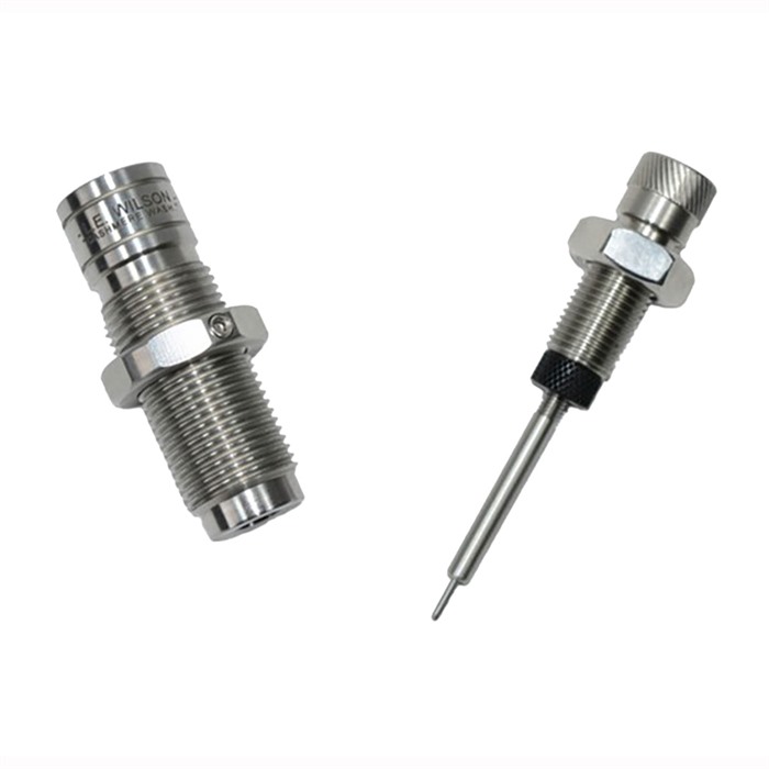 815145026446 The Wilson Bushing Type Full Length Sizing Die. This die will allow you to size the case neck to your desired neck tension along with sizing down the rest of the case body at the same time. Die includes an adjustable depth decapping rod. An extra Decapping Punch is included. These dies do not contain an expander. Made of High Quality Heat Treated Steel. These Full Length Bushing dies mimic the neck sizing of Wilsons’ neck sizing dies and are designed to leave 3/16” at the bottom of the case neck unsized, a practice many shooters prefer and find to be more accurate than sizing the full neck. Mad from High Quality Material - Hardened to L.E. Wilson Specifications Harder than a Grade 8 Bolt Interchangeable Bushings Standard 7/8ths Reloading Press Sizes Shoulder and Body Dimensions Stainless Parts for a Long Lasting Finish Durable and Accurate L.E. Wilson manufactured lock nut - thickness is .225" from inside to outermost edge .270" for height and 1.250" total width OD. Neck Bushing sold separately, we suggest using LE Wilson Neck bushings but Redding bushings will also fit.Delivery time approx. 7-14 days.