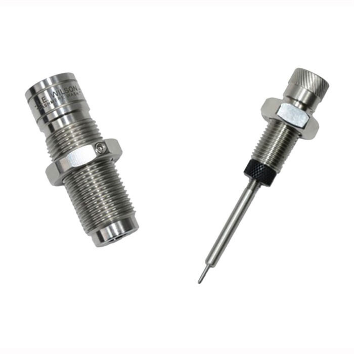 815145026521 The Wilson Bushing Type Full Length Sizing Die. This die will allow you to size the case neck to your desired neck tension along with sizing down the rest of the case body at the same time. Die includes an adjustable depth decapping rod. An extra Decapping Punch is included. These dies do not contain an expander. Made of High Quality Heat Treated Steel. These Full Length Bushing dies mimic the neck sizing of Wilsons’ neck sizing dies and are designed to leave 3/16” at the bottom of the case neck unsized, a practice many shooters prefer and find to be more accurate than sizing the full neck. Mad from High Quality Material - Hardened to L.E. Wilson Specifications Harder than a Grade 8 Bolt Interchangeable Bushings Standard 7/8ths Reloading Press Sizes Shoulder and Body Dimensions Stainless Parts for a Long Lasting Finish Durable and Accurate L.E. Wilson manufactured lock nut - thickness is .225" from inside to outermost edge .270" for height and 1.250" total width OD. Neck Bushing sold separately, we suggest using LE Wilson Neck bushings but Redding bushings will also fit.Delivery time approx. 7-14 days.