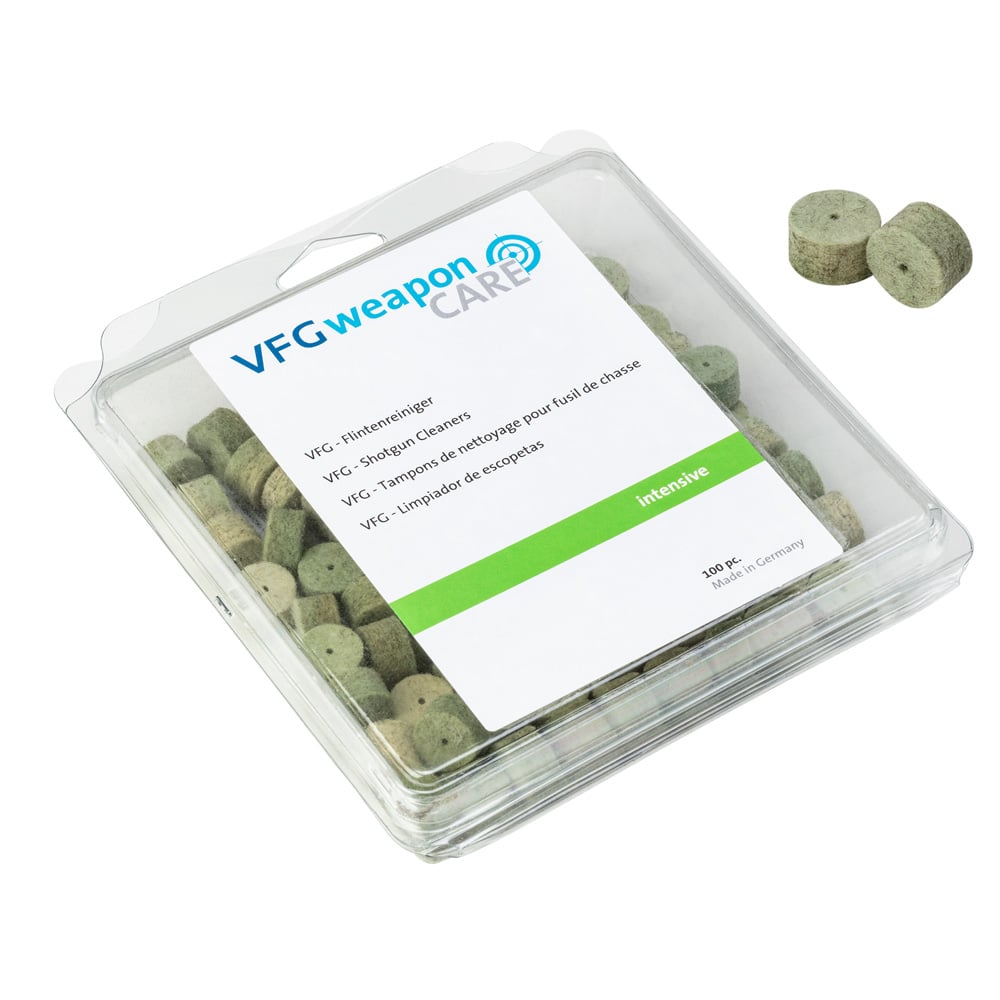 4260419147772 The INTENSIVE barrel cleaner combines the advantages of the VFG COMFORT barrel cleaner made of wool felt with those of the bronze brush or steel wool and is therefore highly abrasive, elastic and absorbent. The INTENSIVE barrel cleaner guarantees even more efficient cleaning on the inside of the barrel or inside the cartridge chambers in revolver drums. This means that you clean without cleaning brushes, steel wool or similar highly abrasive cleaning tools. With the VFG barrel cleaner INTENSIVE you can be sure that, thanks to the optimally coordinated caliber size, material density and elasticity, that they really go deep into the Trains of the fields and will absorb all the dirt particles thanks to their porous surface structure - not as with brushes, who only move the dirt alongside itself in the barrel while running. Specs:Caliber: 12 Gauge Contains:Barrel cleaner Intensive (100 pieces)Discontinued by manufacturer