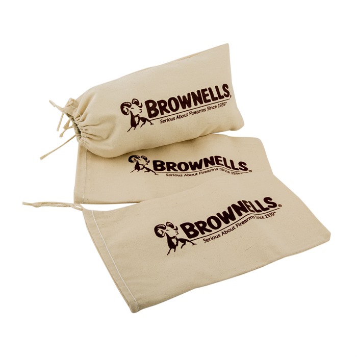 050806022089 Because most of the big ammo companies have gone to plastic shot bags, finding those extra heavy-duty, canvas types we Ol Timers used to shoot off is almost impossible. That s why our gang decided to bring them back in better form than ever! We kept things simple, like they used to be...just good-old-fashioned, rugged and dependable, 10oz. heavy-weight duck canvas bags that hold whatever fill medium you want to put inside. Whether you need a bunch for the guys at your local gun club or just a few for out on the prairie dog towns, they provide excellent stability, portability, and no-scratch support for the forend and buttstock when precise accuracy is absolutely critical. More robust than standard shot bags of the past, plus they include a built-in drawstring for fast, easy closure if you don t like sewing the ends up after filling. Attractive silkscreen on one side features the Brownells ram and trademark. Available singly and in 3-paks.Backorderable, delivery time approx. 4-12 weeks from the USA warehouse.