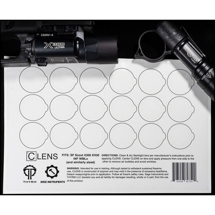 703558827500 CLENS LENS PROTECTION FOR FLASHLIGHTS AND WEAPON LIGHTS Lights only work well when their lenses are clean. Each CLENS Protector provides an easy way to protect lenses during extended shooting sessions. Just like goggle tear-offs for off-road riding, just remove the dirty CLENS to return your light to its optimal brightness. CLENS (pronounced “cleanse”) come as a set of heat-resistant clear polymer circles, cut to fit on a wide range of flashlight and weapon-light lenses. Each CLENS Protector protects the lens from carbon and other debris that can build up during firearms training. Each CLENS Protector has a small tear-away tab. The CLENS Protector can be removed to quickly clean a light, rather than having to apply Vaseline before shooting, replace a lens, or risk abrasion with lens cleaners. Each CLENS’ mild adhesive backing has a higher affinity for polymer than glass. Attach and position easily, without leaving adhesive on clean glass. However, the adhesive may stick to a dirty or damaged lens. In this case, touching the sticky side of the CLENS to any residual adhesive should remove the adhesive from the lens. Designed and manufactured in the USA. * Follow all firearm safety rules at all times. Detach lights from firearms prior to installing, removing, cleaning, or replacing the CLENS.Delivery time approx. 7-14 days.
