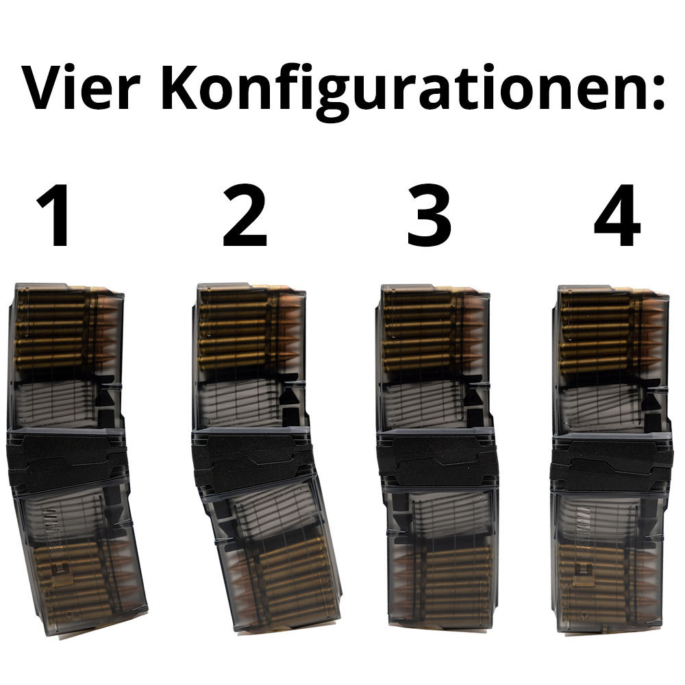 In next to no time two mags can been coupled to each other in four different ways without the use of any tools.Thus one can adjust the configuration to his personal prefence.
