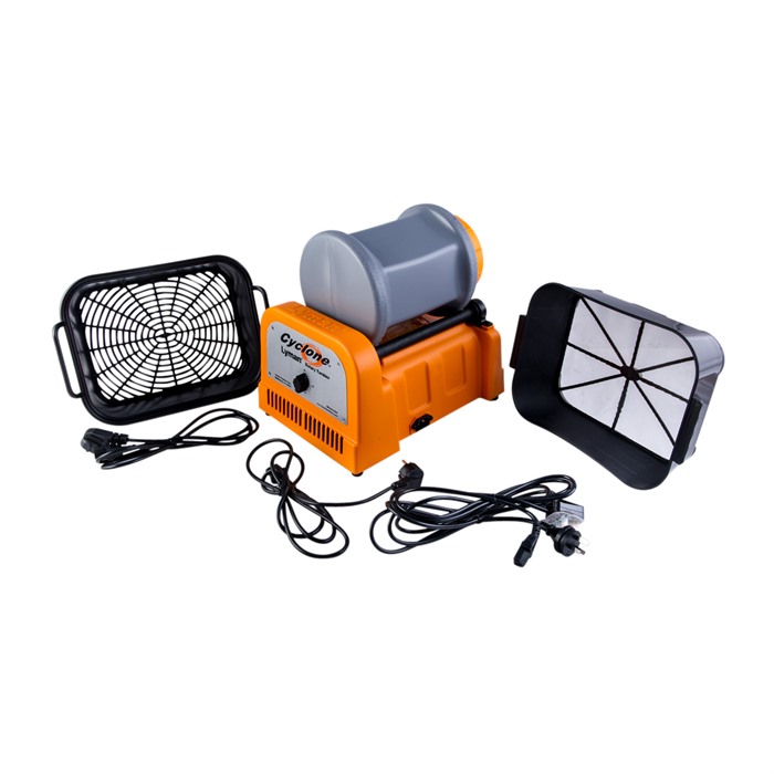 011516715517 The Cyclone Rotary Tumbler takes brass cleaning to a whole new level. The rotary tumbling action combined with the stainless steel media and liquid cleaning solution gets brass cleaner on the outside than vibratory tumbling methods. The small stainless pins easily slip inside cases and into primer pockets to provide superior cleaning action in these areas. Something that vibratory tumbler will not do! The large capacity drum holds up to 1000 pieces of .223 brass and features a rubber lining to protect brass and greatly reduce noise during operation. A built in timer in the base can be set to run from 0 to 3 hours, shutting off automatically. The drum features a large end cap to allow easy loading and unloading. In addition, the tumbler comes with a pair of unique sifter pans which makes separating pins from the cases a breeze! Simply empty the tumbler into the stacked pans. The first pan catches the brass, while the second fine screen pan catches the pins. Five pounds of stainless media pins and a sample packet of Brass Cleaning Solution are also included.Delivery time approx. 7-14 days.
