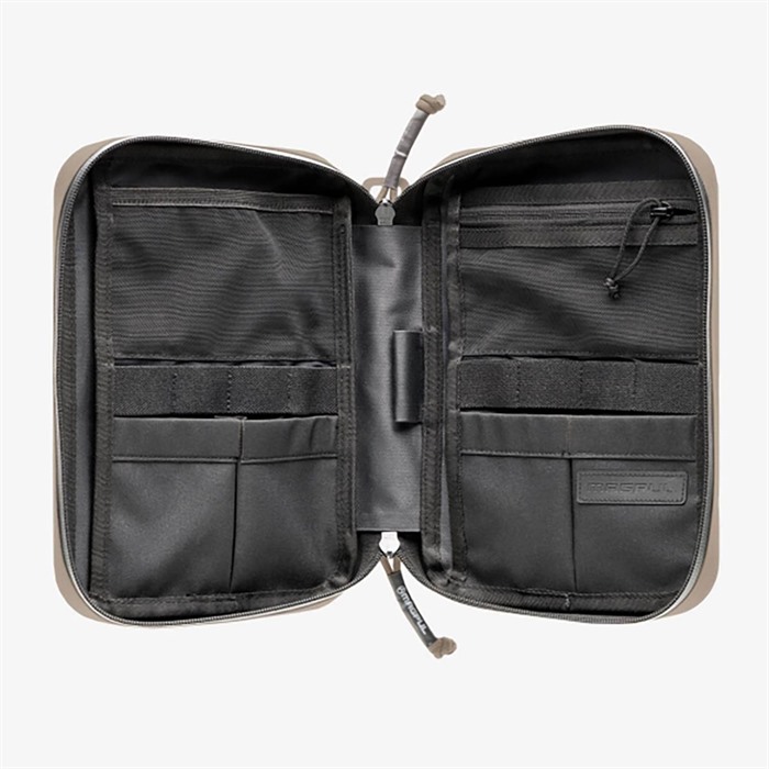 840815144885 The DAKA Utility Organizer, Large is a durable, weather-resistant, compact case designed to protect, store, and secure your important everyday use gear. Reinforced by its semi-rigid construction, the Utility Organizer, Large provides more room to protect important items, making it the perfect admin pouch, travel kit, large electronics case, range accessory kit, and storage kit for just about anything you want to have handy. The exterior features a water-resistant?YKK®?AquaGuard®?zipper?with a large zipper pull for easy access and closure. The oversized pull tab and carabiner pass-through keep your gear at hand when you need it, and the pen dot matrix makes ID of what’s stored within easy. The left interior panel consists of one main back-side pocket, one mesh pocket, four 1.5-inch stretch molle, and two stretch pockets. The right interior panel consists of one main back-side panel for notepad storage, one mesh zippered pocket, four 1.5-inch stretch molle, and two stretch pockets. Like all Magpul’s DAKA products, the Magpul DAKA Utility Organizer, Large is made from polymer-infused textiles that are RF-welded on every seam for absolute strength. The construction methods and materials used in the DAKA line mean that our storage solutions are at home in a variety of hard-use outdoor applications, yet they’re stylish enough to be front and center in your vehicle or office. Overall dimensions: 10.6" x 8.0" x 2.3” 2 Main Back-side Pockets: 9" x 6.5” 1 Mesh Pocket: 3.5" x 6” 1 Zippered Mesh Pocket: 3.25" x 6” 8 Stretch MOLLE: 1.5” 4 Admin Pockets: 4" x 3”Backorderable, delivery time approx. 4-12 weeks from the USA warehouse.