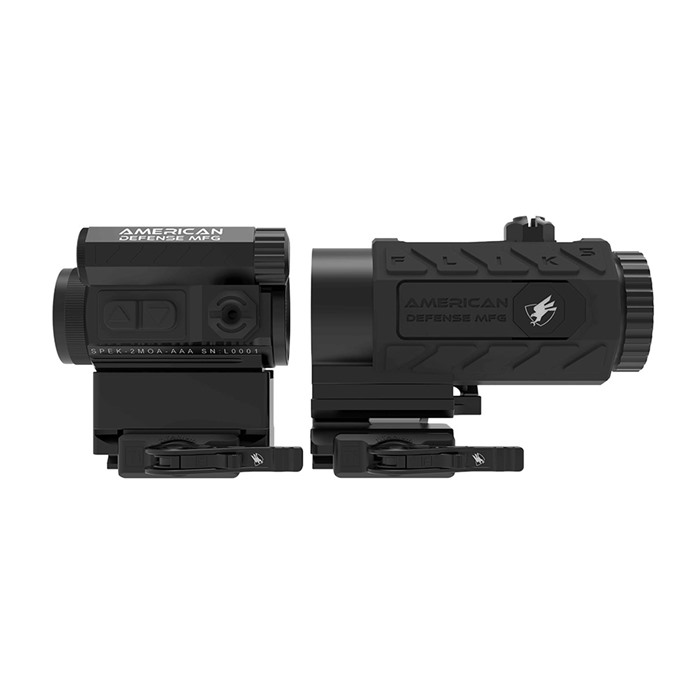 - The American Defense DUO 5 optics package includes a Spek Red Dot sight powered by a single AAA battery with a lifespan of up to five years.