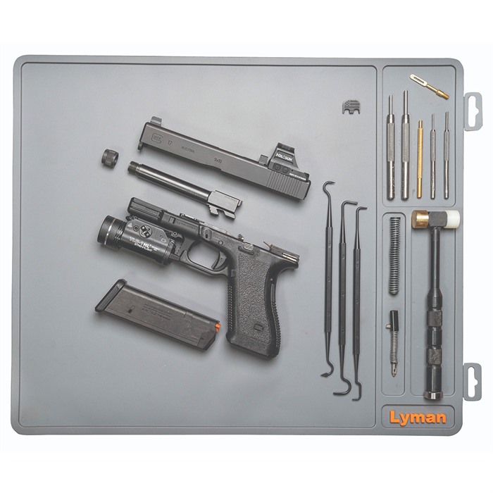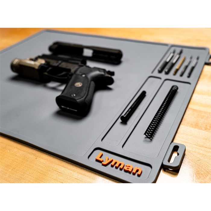 011516040749 Protect your gun and your workbench. Work like a pro on your Lyman Gun Mat. The firm, yet cushioned surface is perfect for assembling and disassembling firearms (or lots of other hobbies!) for cleaning or maintenance and repair. The molded compartments contain spills and keep small parts out of the way of the main work area but still handy and organized. The mats are chemical resistant and clean easily with soap and water. New Armorer’s Mat measures 16" x 19" SPECS: Chemical Resistant Made from synthetic rubber for a non-slip surface Protects your gun’s finish and your bench’s finish Molded-in storage compartments keep parts secured & organizedDelivery time approx. 7-14 days.