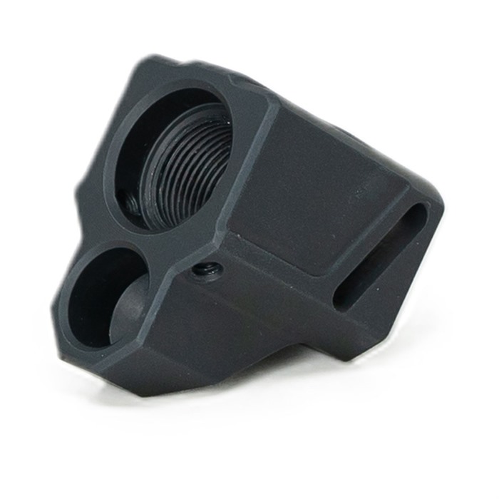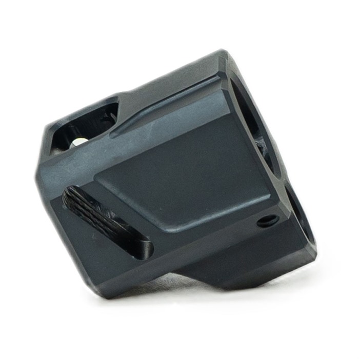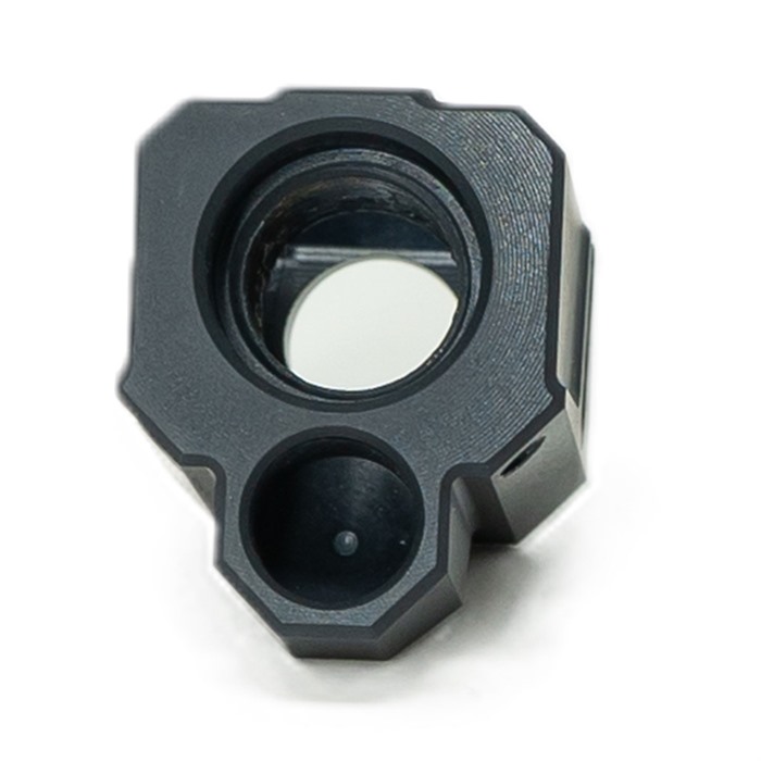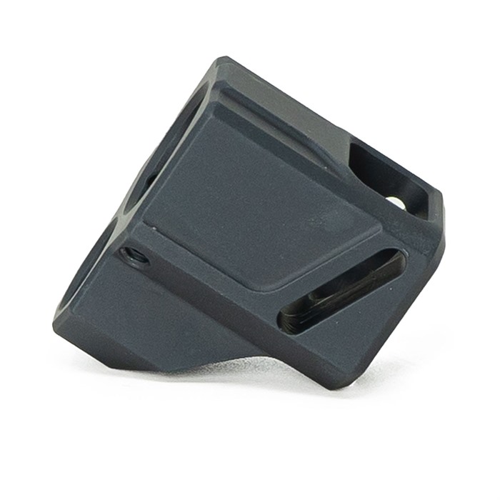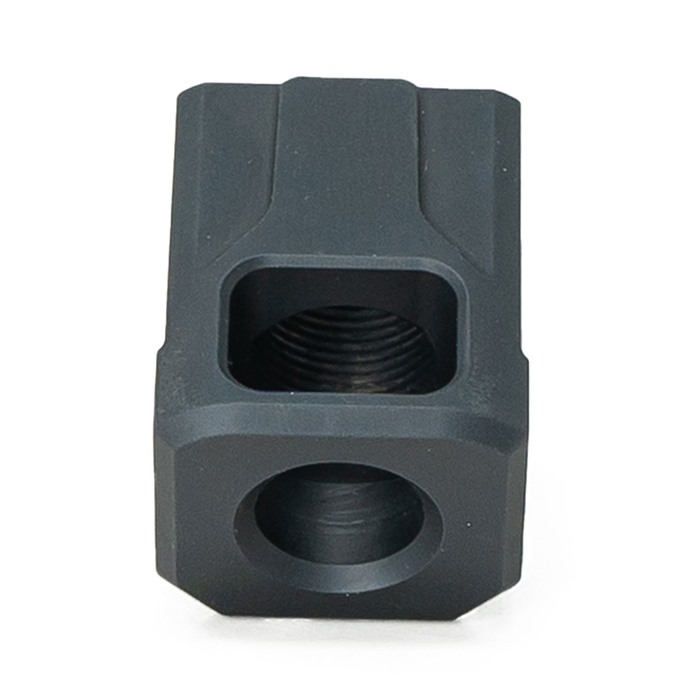 Constructed from 6061 Aluminum with a sleek black anodized finish, the Faxon Pistol Compensator features a uniquely angled front port single chamber design. This innovative design: