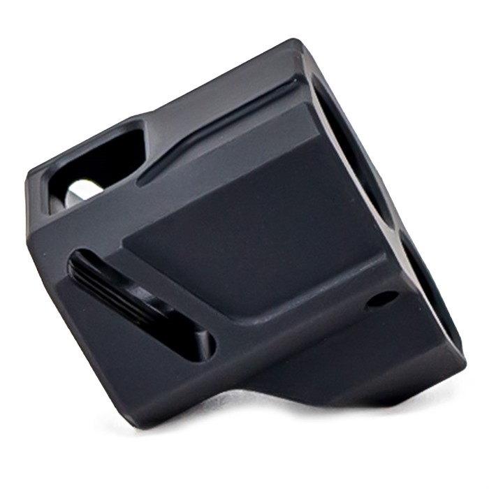 Constructed of 6061 Aluminum with a black anodized finish, Faxon Pistol Compensators feature a uniquely angled front port single chamber design. This innovative design enables the compensator to: