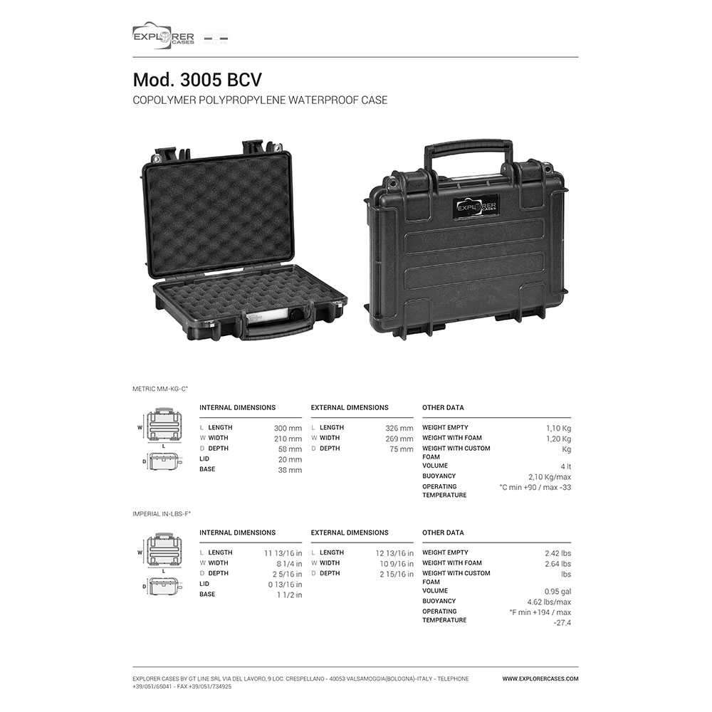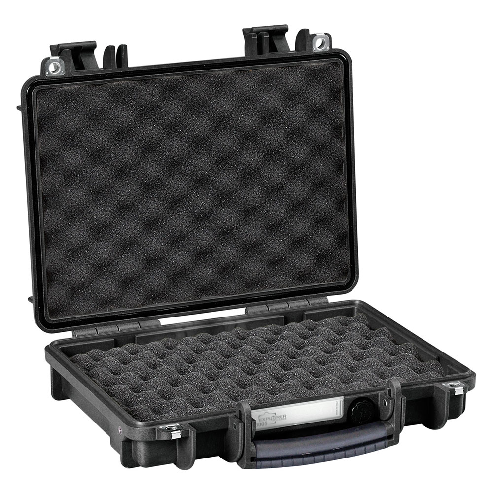 8024482181967 The best protection for your most precious baby - The ultimate weapon case with a variety of functions in the highest quality, manufactured by Explorer Cases in Italy. Specs: Length: 326mm (300mm inside) Width: 269mm (210mm inside) Depth: 75mm (58mm inside) Weight: 1,20kg (1,10kg empty weight without inlay) Color : Black Inlay: Convoluted Foam Literally indestructible The weapon cases from Explorer Cases each have corrosion proof metal hinges with lid stay features, which fixate the cover and hold it into place when opened. So you can rest assured that your weapon cases will assist you a long long time. Thanks to the locking latches the weapon cases are always highly secured. The O-ring gasket also makes them water resistant to a great extend. Every weapon case is equipped with a manual air pressure release valve. Therefore you can take it easy and will have no problem handling and closing the case. Exactly how you want it The cases are provided with internal cutouts for optional internal brackets or mounting rings, so you can store everything exactly as it is most suitable for your requirements. Every single suitcase comes with a waterproof removable label with which you can label your equipment or store your data. The case can either be transported traditionally via the large front handle or via optional shoulder straps, which can be easily attached to any model. The 3005 series is optimized for the transportation by airplane.Backordered, delivery from manufacturer overdue.