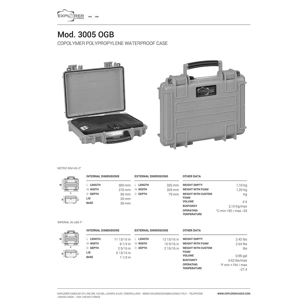 8024482184937 The best protection for your most precious baby - The ultimate weapon case with a variety of functions in the highest quality, manufactured by Explorer Cases in Italy. Specs: Length: 326mm (300mm inside) Width: 269mm (210mm inside) Depth: 75mm (58mm inside) Weight: 1,20kg (1,10kg empty weight without inlay) Color : Black Inlay: Convoluted Foam Literally indestructible The weapon cases from Explorer Cases each have corrosion proof metal hinges with lid stay features, which fixate the cover and hold it into place when opened. So you can rest assured that your weapon cases will assist you a long long time. Thanks to the locking latches the weapon cases are always highly secured. The O-ring gasket also makes them water resistant to a great extend. Every weapon case is equipped with a manual air pressure release valve. Therefore you can take it easy and will have no problem handling and closing the case. Exactly how you want it The cases are provided with internal cutouts for optional internal brackets or mounting rings, so you can store everything exactly as it is most suitable for your requirements. Every single suitcase comes with a waterproof removable label with which you can label your equipment or store your data. The case can either be transported traditionally via the large front handle or via optional shoulder straps, which can be easily attached to any model. The 3005 series is optimized for the transportation by airplane.Delivery time approx. 6-10 days.