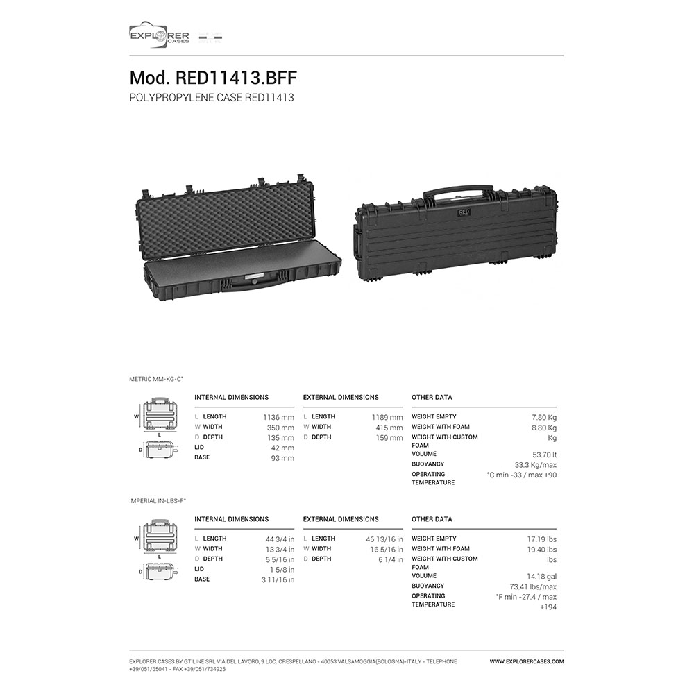 8024482183657 The best protection for your most precious baby - The ultimate weapon case with a variety of functions in the highest quality, manufactured by Explorer Cases in Italy. Specs: Length: 1189mm (1136mm inside) Width: 415mm (350mm inside) Depth: 159mm (135mm inside) Weight: 8,80kg (7,80kg without inlay) Color : Black Inlay: Density Full Foam Literally indestructible The weapon cases from Explorer Cases each have corrosion proof metal hinges with lid stay features, which fixate the cover and hold it into place when opened. So you can rest assured that your weapon cases will assist you a long long time. Thanks to the locking latches the weapon cases are always highly secured. The O-ring gasket also makes them water resistant to a great extend. Every weapon case is equipped with a manual air pressure release valve. Therefore you can take it easy and will have no problem handling and closing the case. Exactly how you want it The cases are provided with internal cutouts for optional internal brackets or mounting rings, so you can store everything exactly as it is most suitable for your requirements. Every single suitcase comes with a waterproof removable label with which you can label your equipment or store your data. The case can either be transported traditionally via the large front handle or via optional shoulder straps, which can be easily attached to any model. The Mod Red 11413 series can also be used as trolley case.Delivery time approx. 6-10 days.