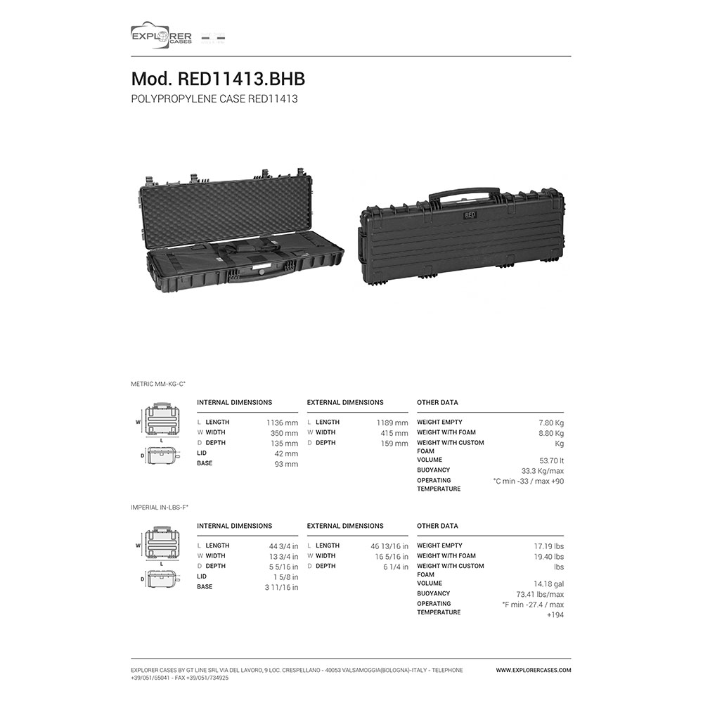 8024482182940 The best protection for your most precious baby - The ultimate weapon case with a variety of functions in the highest quality, manufactured by Explorer Cases in Italy. Specs: Length: 1189mm (1136mm inside) Width: 415mm (350mm inside) Depth: 159mm (135mm inside) Weight: 8,80kg (7,80kg without inlay) Color : Black Inlay: incl. 2 Gunbags Literally indestructible The weapon cases from Explorer Cases each have corrosion proof metal hinges with lid stay features, which fixate the cover and hold it into place when opened. So you can rest assured that your weapon cases will assist you a long long time. Thanks to the locking latches the weapon cases are always highly secured. The O-ring gasket also makes them water resistant to a great extend. Every weapon case is equipped with a manual air pressure release valve. Therefore you can take it easy and will have no problem handling and closing the case. Exactly how you want it The cases are provided with internal cutouts for optional internal brackets or mounting rings, so you can store everything exactly as it is most suitable for your requirements. Every single suitcase comes with a waterproof removable label with which you can label your equipment or store your data. The case can either be transported traditionally via the large front handle or via optional shoulder straps, which can be easily attached to any model. The Mod Red 11413 series can also be used as trolley case.Backorderable, delivery time approx. 4-12 weeks from the European warehouse.