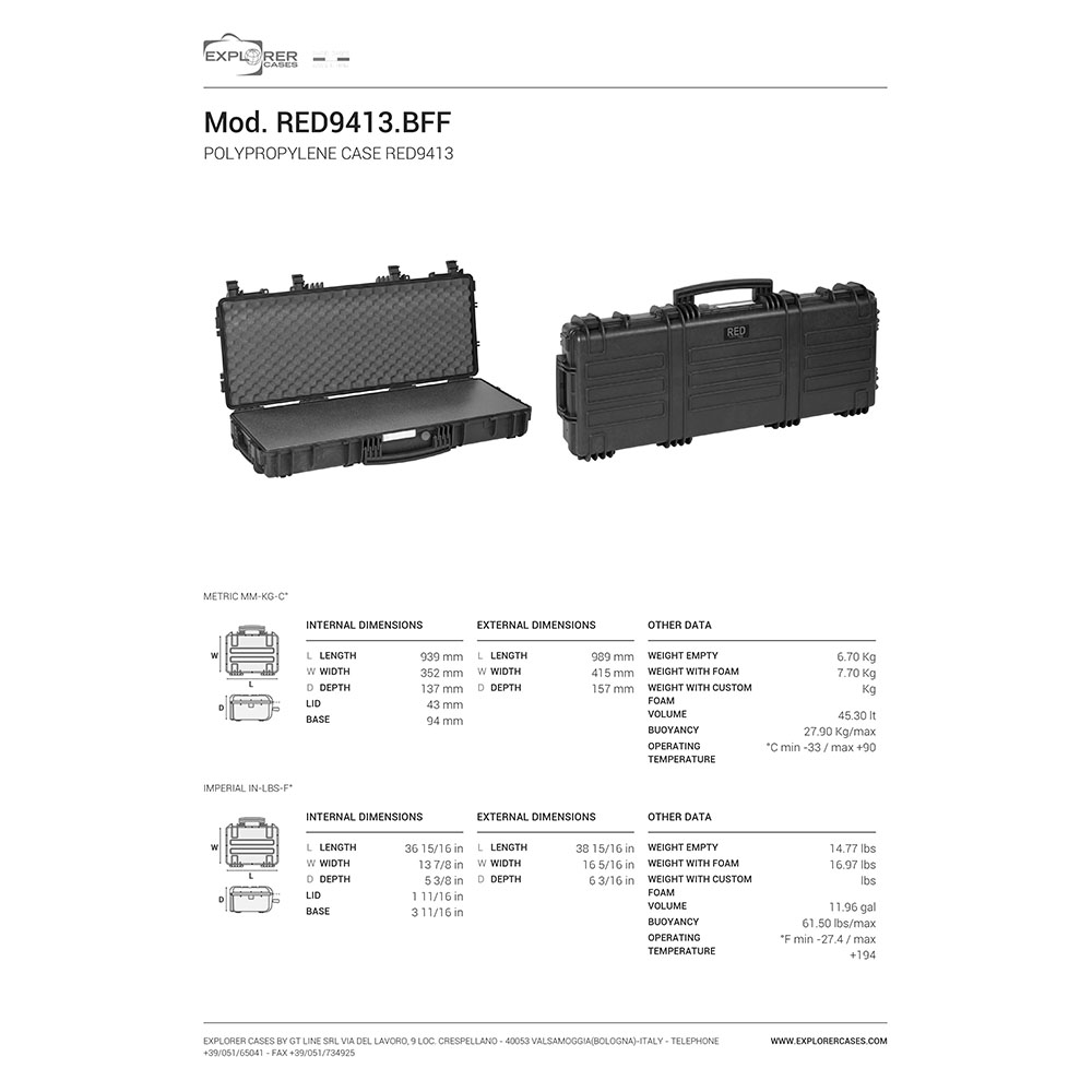 8024482183671 The best protection for your most precious baby - The ultimate weapon case with a variety of functions in the highest quality, manufactured by Explorer Cases in Italy. Specs: Length: 989mm (939mm inside) Width: 415mm (352mm inside) Depth: 157mm (137mm inside) Weight: 7,70kg (6,70kg without inlay) Color : Black Inlay: Density Full Foam Literally indestructible The weapon cases from Explorer Cases each have corrosion proof metal hinges with lid stay features, which fixate the cover and hold it into place when opened. So you can rest assured that your weapon cases will assist you a long long time. Thanks to the locking latches the weapon cases are always highly secured. The O-ring gasket also makes them water resistant to a great extend. Every weapon case is equipped with a manual air pressure release valve. Therefore you can take it easy and will have no problem handling and closing the case. Exactly how you want it The cases are provided with internal cutouts for optional internal brackets or mounting rings, so you can store everything exactly as it is most suitable for your requirements. Every single suitcase comes with a waterproof removable label with which you can label your equipment or store your data. The case can either be transported traditionally via the large front handle or via optional shoulder straps, which can be easily attached to any model. The Mod Red 9413 series can also be used as trolley case.Delivery time approx. 6-10 days.