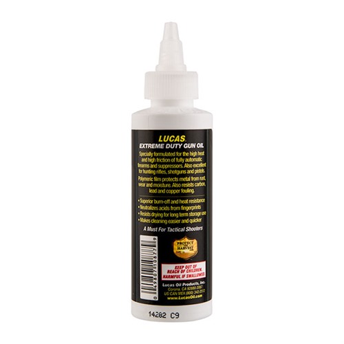 Developed for demanding lubrication during hard use, Lucas Extreme Duty Gun Oil operates effectively within an extreme working temperature range of -38°F to 400°F. It is also great for use in ultrasonic cleaners for small or bulk parts lubrication, providing superior blow back resistance to keep oil out of your face and off your glasses.