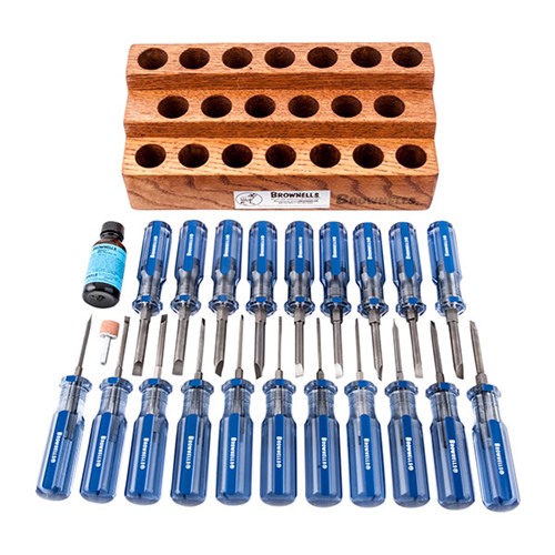 050806007680 We're tickled as all get out to offer our Fixed-Blade, Gunsmith's Screwdriver Set designed and developed by gunsmiths for those gunsmiths who love solid, fixed-blade screwdrivers that fit their gun screws right - and simply won't have it any other way! THE PERFECT TIP & BLADE We started with the tip of the blade, the part that has to fit the gun screw properly, and the most important part of a gunsmith's screwdriver. The blade tips are then custom, precision-ground in a crisply radiused, hollow-ground shape to give maximum strength. And, the ideal parallel section is ground at the tip to fit the screw slot properly through the full width and depth of the slot. (This is what keeps you from buggering screws - a blade tip that evenly distributes the turning torque applied at the handle to the full width and depth of the screw slot.) We made the blades short (you're only 2½" from the work piece) to give you maximum control, eliminate wobble and tilt. Yet, they are long enough to give you a good view of the work you are doing. Tolerances are kept extremely tight for the entire blade, and the entire blade/shank is hardened to Rc 58-60 for proper, maximum strength and toughness in a screwdriver. THE SHANK DESIGN The long parallel shank maintains the same diameter as the width of the blade. This allows repeated regrinding’s and reshaping’s while still maintaining the original blade width. In addition, it allows the screwdriver to go into holes or recesses that are only screw-slot wide. The hex section allows you to use either an open-end wrench or one of the Midget Ratchets for more turning power on the heavier blades. Finally, we put a size-sequence number - from 1 (smallest) to 20 (largest) on the hex section of each individual screwdriver so you can pick the size you want quickly. HANDLE CUSTOM-DESIGNED FOR YOU The handles are custom-made to our specifications to fit your hand well. They aren't too bulky, yet give a mighty good grip when large, tight screws have to be broken loose, and "fingertip" control when dealing with tiny, delicate screws. We use the same handle on all 20 screwdrivers to keep the same hand-fit and feel throughout the set. DISTINCTIVE PRESENTATION BENCH BLOCKS In keeping with the superb quality of the screwdrivers, we designed two magnificent Solid Oak Bench Blocks to hold your Fixed-Blade Gunsmith's Screwdrivers. They are real beauties. Each one has 3 tiers to make them compact, you can see both the width/thickness of the blade, the identifying number stamped on one flat of the exposed hex section and, the 20 holes (Master block) or 10 holes (Add-On block) are far enough apart for good finger room. Every Bench Block is finished in a tough, non-gloss lacquer, and has anti-skid feet to keep it in place on your bench. Finally, the Master Set Block includes a Personalized Name Plate for you to mount on your Bench Block, we have included the order form with each Block for you to choose which style of plate you want and the wording you would like. It's all paid for - and makes the Block perfect for awards or gifts, and just telling the world the Screwdrivers belong to you. The Add-On Block for the Super Master Set does not include the name plate. SETS AVAILABLE We've packaged the Screwdrivers two ways: The Master Set™ has all 20 Screwdrivers, plus the properly radiused Bit Shaping Stone, the Bench Block, and a bottle of Brownells Best Penetrating Oil™. To create The Super Master Set™ we took the Master Set and added 6 Allen head fixed blade screwdrivers, 3 Phillips "Anti-Cam" screwdrivers, and the Add-On Block. As with all our tools and supplies, they are guaranteed to please you, the most demanding craftsman in the world - the working gunsmith.Backorderable, delivery time approx. 4-12 weeks from the USA warehouse.