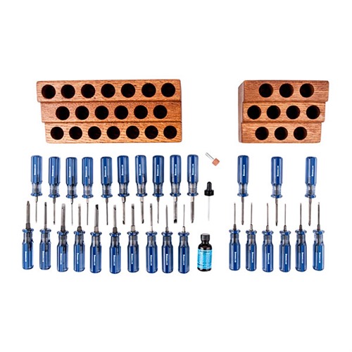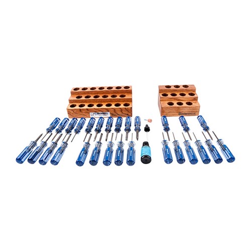 050806007697 We're tickled as all get out to offer our Fixed-Blade, Gunsmith's Screwdriver Set designed and developed by gunsmiths for those gunsmiths who love solid, fixed-blade screwdrivers that fit their gun screws right - and simply won't have it any other way! THE PERFECT TIP & BLADE We started with the tip of the blade, the part that has to fit the gun screw properly, and the most important part of a gunsmith's screwdriver. The blade tips are then custom, precision-ground in a crisply radiused, hollow-ground shape to give maximum strength. And, the ideal parallel section is ground at the tip to fit the screw slot properly through the full width and depth of the slot. (This is what keeps you from buggering screws - a blade tip that evenly distributes the turning torque applied at the handle to the full width and depth of the screw slot.) We made the blades short (you're only 2½" from the work piece) to give you maximum control, eliminate wobble and tilt. Yet, they are long enough to give you a good view of the work you are doing. Tolerances are kept extremely tight for the entire blade, and the entire blade/shank is hardened to Rc 58-60 for proper, maximum strength and toughness in a screwdriver. THE SHANK DESIGN The long parallel shank maintains the same diameter as the width of the blade. This allows repeated regrinding’s and reshaping’s while still maintaining the original blade width. In addition, it allows the screwdriver to go into holes or recesses that are only screw-slot wide. The hex section allows you to use either an open-end wrench or one of the Midget Ratchets for more turning power on the heavier blades. Finally, we put a size-sequence number - from 1 (smallest) to 20 (largest) on the hex section of each individual screwdriver so you can pick the size you want quickly. HANDLE CUSTOM-DESIGNED FOR YOU The handles are custom-made to our specifications to fit your hand well. They aren't too bulky, yet give a mighty good grip when large, tight screws have to be broken loose, and "fingertip" control when dealing with tiny, delicate screws. We use the same handle on all 20 screwdrivers to keep the same hand-fit and feel throughout the set. DISTINCTIVE PRESENTATION BENCH BLOCKS In keeping with the superb quality of the screwdrivers, we designed two magnificent Solid Oak Bench Blocks to hold your Fixed-Blade Gunsmith's Screwdrivers. They are real beauties. Each one has 3 tiers to make them compact, you can see both the width/thickness of the blade, the identifying number stamped on one flat of the exposed hex section and, the 20 holes (Master block) or 10 holes (Add-On block) are far enough apart for good finger room. Every Bench Block is finished in a tough, non-gloss lacquer, and has anti-skid feet to keep it in place on your bench. Finally, the Master Set Block includes a Personalized Name Plate for you to mount on your Bench Block, we have included the order form with each Block for you to choose which style of plate you want and the wording you would like. It's all paid for - and makes the Block perfect for awards or gifts, and just telling the world the Screwdrivers belong to you. The Add-On Block for the Super Master Set does not include the name plate. SETS AVAILABLE We've packaged the Screwdrivers two ways: The Master Set™ has all 20 Screwdrivers, plus the properly radiused Bit Shaping Stone, the Bench Block, and a bottle of Brownells Best Penetrating Oil™. To create The Super Master Set™ we took the Master Set and added 6 Allen head fixed blade screwdrivers, 3 Phillips "Anti-Cam" screwdrivers, and the Add-On Block. As with all our tools and supplies, they are guaranteed to please you, the most demanding craftsman in the world - the working gunsmith.Backorderable, delivery time approx. 4-12 weeks from the USA warehouse.