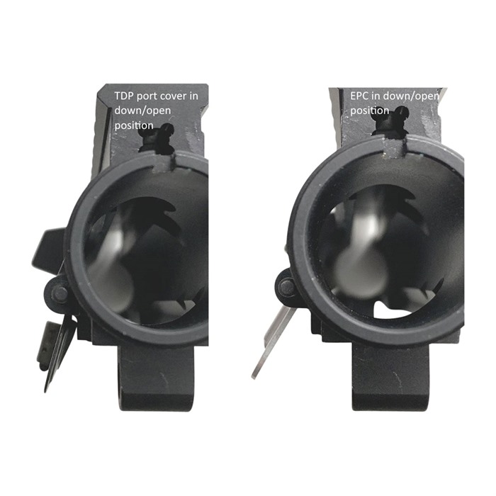 - Innovative Tab Design: The EPC features two "tabs" flanking the cutout for the port cover spring, allowing it to rest on the upper at a greater angle when in the down/open position. This design creates more space between the port cover and lower receiver, facilitating easier access for the user's finger.