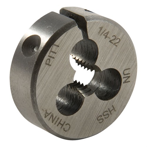 These dies are available in a range of fractional sizes, accommodating diverse threading needs. Each die features a 13/16" outer diameter, making them compatible with standard die stocks. The use of carbon steel allows for easy removal of broken die fragments, as they can be shattered with a punch if necessary.