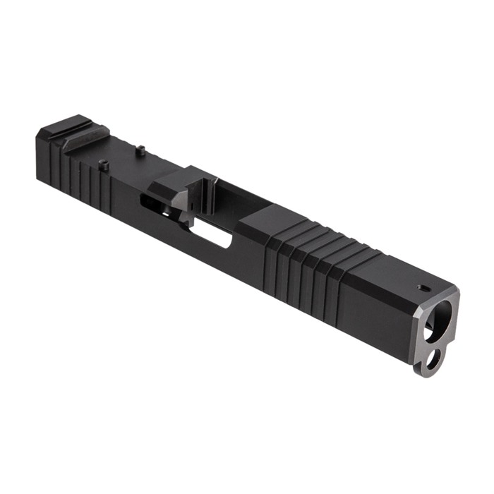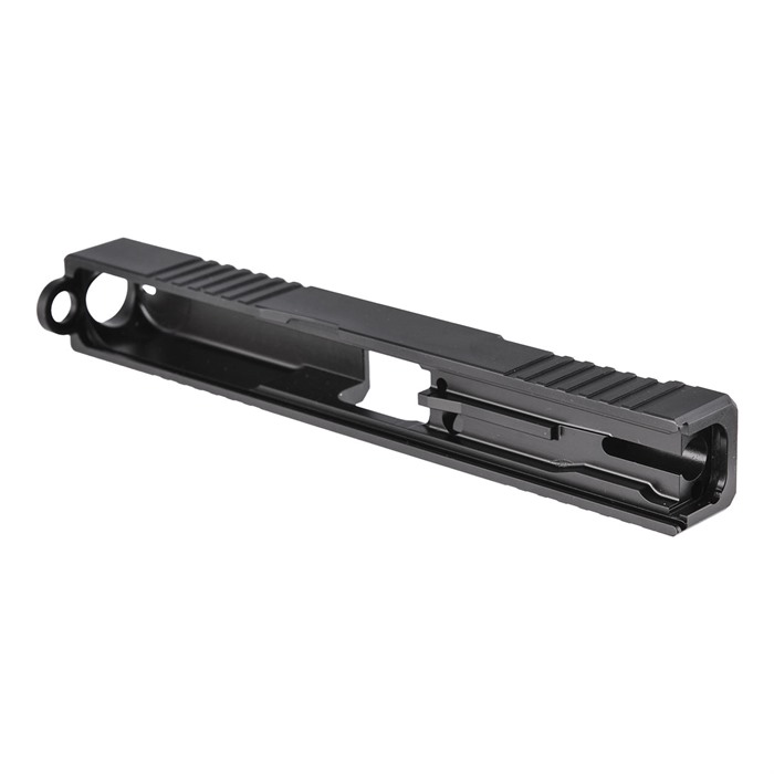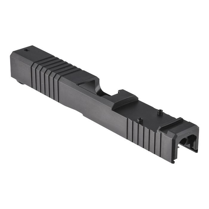 - The slide is compatible with factory frames and aftermarket parts, and offers a "window" cutout option to display custom barrels and enhance barrel cooling.